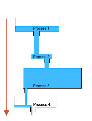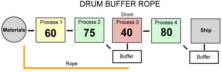 One final method used to subordinate other functions to the bottleneck is through the use of a Drum Buffer Rope system. A Drum Buffer Rope basically is a system of WIP management that provides a sufficient buffer of raw material for the bottleneck so that it is never effected by shortages. The discussion of this system is beyond the scope of this article, and tackled in our article Drum Buffer Rope.