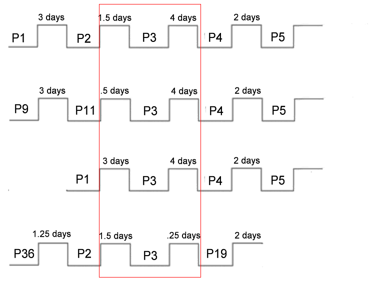If you are running many different products, focus on mapping each route a product can take through the plant, not each individual product. This will greatly reduce the amount of maps required. Like in the last example, ignore process times and focus solely on waiting. However, this time we will want to compare the lead time ladders at a specific processes, as shown below: